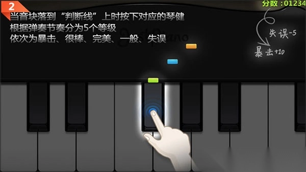 2、当音块落至“判断线”上时,按下相应琴键就行。依据玩家弹奏节奏,可划分成5个等级,从优到差依次是暴击、很棒、完美、一般、失误。出现失误会扣5分,达成暴击则能获得10分。