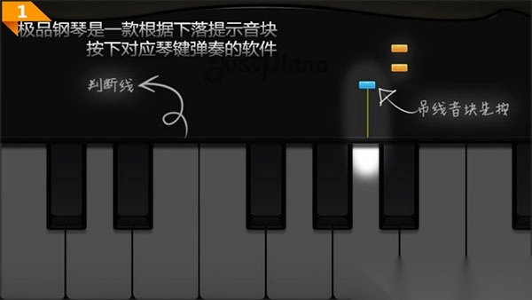 1、极品钢琴是一款根据下落提示音块,按下对应琴键弹奏的游戏,琴键上方的黑线就是判断线,游戏过程中吊线音块需要先按,也就是说,该音块会率先到达判断线处,当音块密集的时候,方便玩家判断。按完该音块之后,就会生成第二个吊线音块,这也算是游戏的一个小提示。