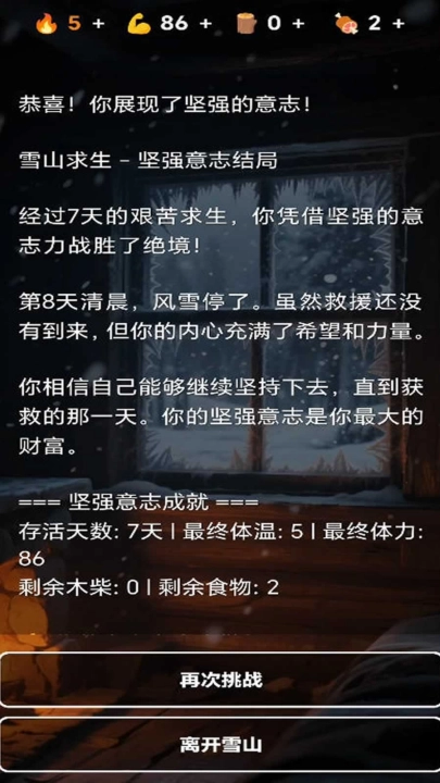 2、资源管理:维持体温是生存的关键。食物与木柴是你仅有的希望,务必谨慎使用。