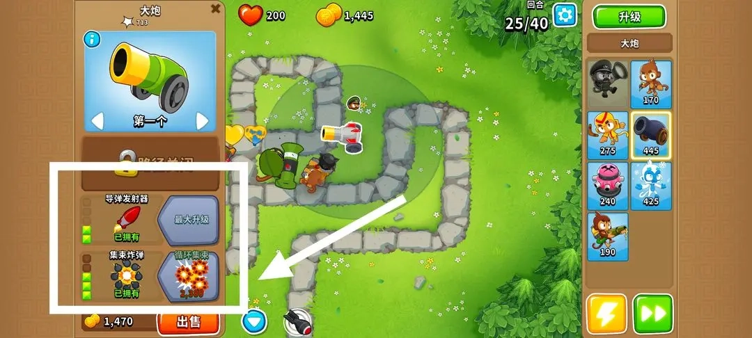 然后金币足够时,点击要升级的猴子。升级的选项也是专精的技能。猴子足够强大,无需任何气球。各个关卡需要的角色各不同,合理搭配才能打出更好的成绩。