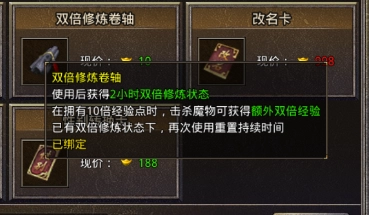 双倍修炼卷轴的来源只能通过商城花费10元宝进行购买,在前期的升级中起很大的作用,在使用十倍经验卷的同时额外获得两个小时的双倍经验!