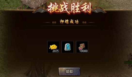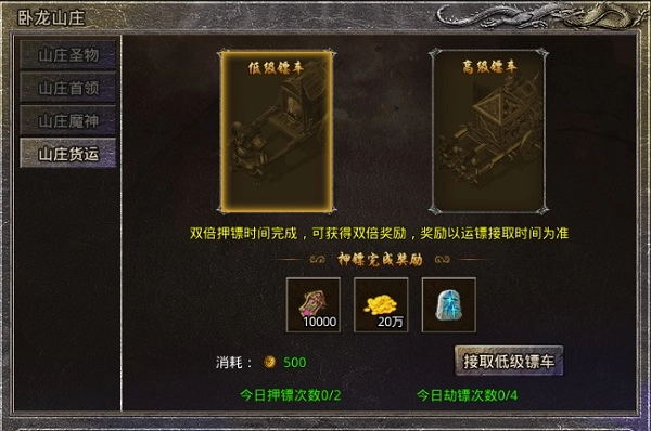 高级镖车押运需要消耗500传奇币和1个卧龙镖令,押运完成奖励(单倍):20000功勋、60万金币、4个生命之息。