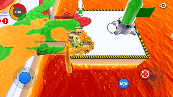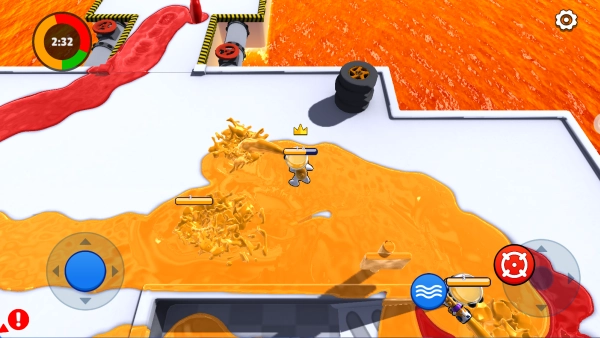 1、操作采用双轮盘控制,左侧移动方向,右侧喷涂油漆,同阵营颜色区域内可“游泳”加速并回复血量,增强机动性与生存能力。 2、团队需紧密配合执行战术,如集中推进抢夺油桶、分路包抄夹击敌人、防守反击稳固领地,并根据道具刷新调整策略。 3、战场随机出现增益道具(如加速喷涂、临时护盾)和战术装备(如区域染色弹、隐身装置),瞬间改变战局走向。