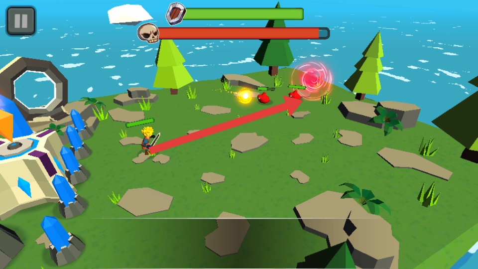 1. 踏入游戏关卡,操纵角色向红色怪物靠近,点击攻击按钮开启战斗,借助武器打出伤害,躲开怪物的反击,逐步消耗敌人的血条。
