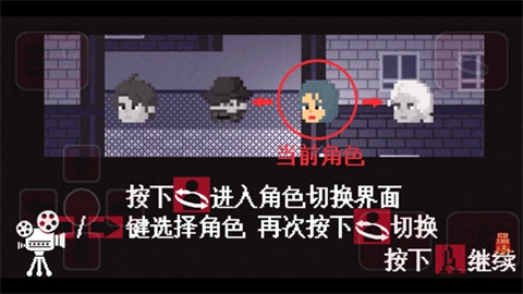 6、最后一项新手引导至关重要:即角色互换。游戏中主要存在四种角色,每个角色所触发的剧本各不相同。若想探寻游戏最终的真相,就需适时切换游戏角色。若要切换角色,只需点击图片所显示的角色切换按钮,接着通过左右键选择你想要切换的角色,选择完毕后再次点击角色切换按钮,便能成功完成切换。