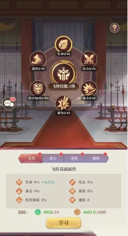 飞将、勇将、谋士、辅助这四种职业,分别对应着各自专属的联盟技能,每一种联盟技能仅对相应的职业产生加成效果。通过消耗铜钱与青龙玉,能够提升对应职业的基础属性。