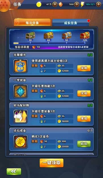 在《龙珠激斗》里,任务系统划分为每日任务与成长任务。每日任务涵盖学习技能、升级装备、购买金币、购买体力、进行召唤之类的日常活动,只要完成任意一项每日任务,就能获取经验、圣水、金币等奖励,而且还能通过累积活跃度得到宝箱奖励。成长任务是依据玩家等级的提升而逐步开放的,在每个成长阶段,系统所给出的成长任务各不相同,完成任意一个成长任务可收获龙石、圣水、金币等奖励。