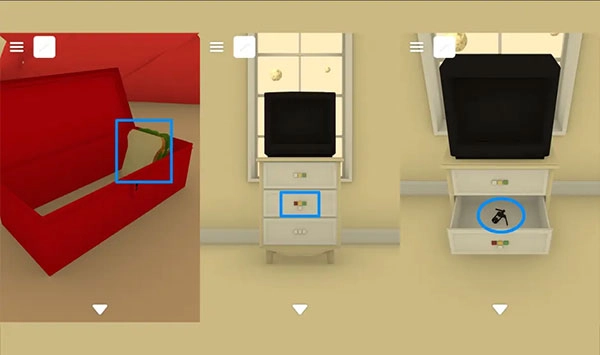 - 点击保险箱,其密码由房间里散落的红色、绿色、蓝色纸张的数量组合而成。