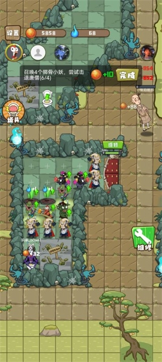 游戏开始30秒后,唐僧便会具备移动能力,且会随机挑选目标展开进攻。一旦你遭受唐僧的攻击,此时可选择升级大门,或者建造小妖来进行防御。