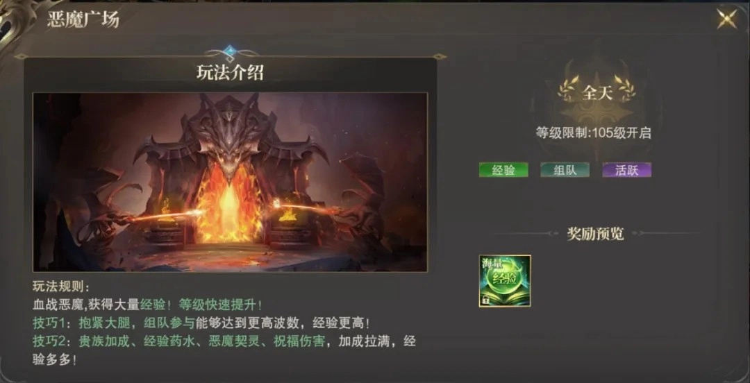 【恶魔广场,拼杀到底】勇闯恶魔广场,直面恶魔开启激战,丰厚海量经验等您来收割!秘籍一:组队协同作战,紧跟强者步伐,冲击更高波数,让经验满满入账!秘籍二:充分利用贵族特权、经验药水、恶魔契灵、祝福伤害,实现全方位属性加成,将经验收益提升至最大化!