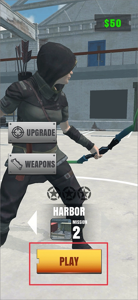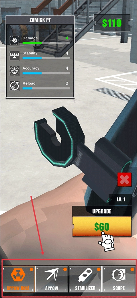 4、在游戏的开始界面中,找到“UPGRADE”选项,通过它你能够对弓箭上的各个配件进行升级。