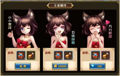 哦,还有一点,在这里能够对相应的玩家进行膜拜。每天仅能挑选一位玩家来膜拜,通过膜拜能够获取技能点与体力。既能够免费膜拜,也能够消耗金币或者钻石来进行膜拜,花费的金额越高,所能得到的奖励也就越多,具体如何选择就看个人的需求了。