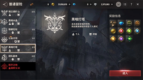 可经由[菜单] - [普通冒险] - [黑暗灯塔]界面进入黑暗灯塔。