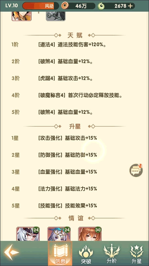 除了这些方面,角色还能够借助升星、提升天赋阶数来增强自身实力,提升这些同样能获取一定的属性加成。前期大家的主要任务,便是尽快提升角色的星级、品质以及天赋阶层,使角色的战斗力足以应对现阶段的战斗。