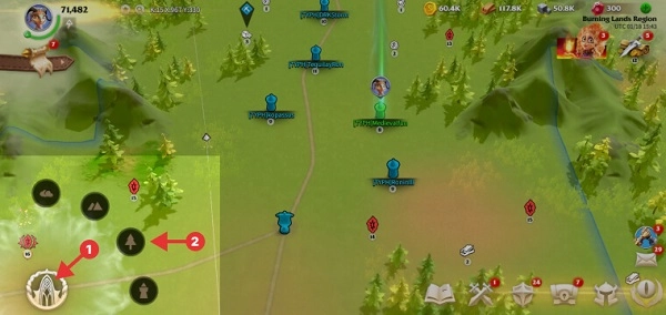 为此,您需按住按钮一秒,随后会弹出4个功能。按从上至下的顺序,前两个功能能直接跳转到世界地图最高级别的缩放界面。之后,您可利用左侧选项,仅查看诸如道路、联盟资源、标记等特定元素。