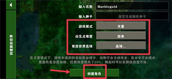 3、完成名称、游戏模式、出生点难度、更改世界选项等设置后,点击创建角色。