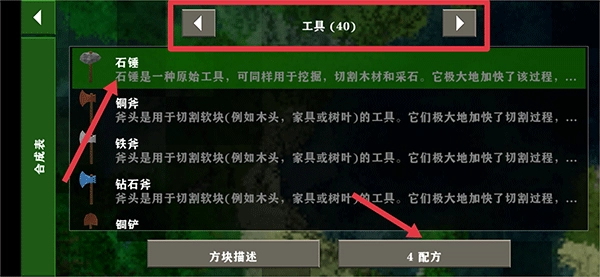 11、依据合成配方的提示,在合成配方里制作有用工具。点击页面上方能够切换合成表,找到想要制作的物品,选中该物品后点击配方。