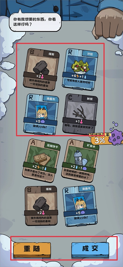 7、接下来,对方会依据你出示的卡牌,给出他的卡牌。要是你对对方给出的卡牌感到满意,就可以点击“成交”;要是不满意,点击“重随”即可。
