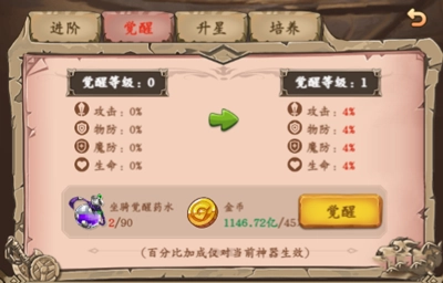 坐骑觉醒:以百分比形式提升英雄的攻击力、生命值、物理防御力以及魔法防御力。