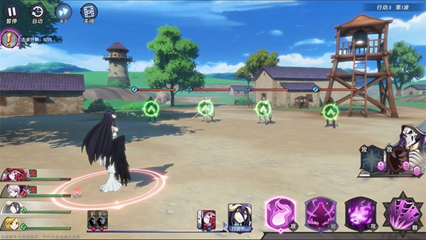《纳萨力克之王》战斗系统的底层玩法为回合制结合卡牌游戏。在此设定上,角色配备三个技能,分别为普攻、被动技能与主动技能。其中,普攻无冷却时间(CD),主动技能则有对应的CD。此外,SR角色与SSR角色还额外拥有一个需在技能系统中激活的EX技能(即大招)。每个技能释放时都带有独特动画,而且每个角色都具备相应的速度属性,该属性会在下方的行动条中体现出来。