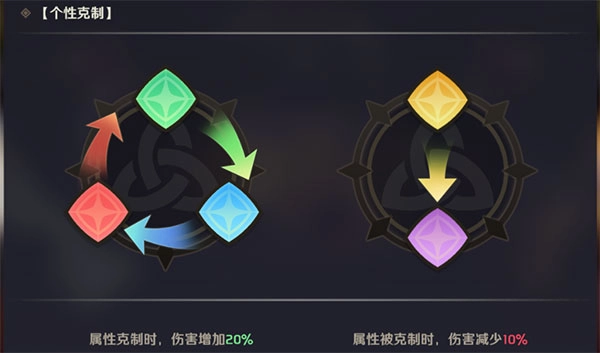 当下的游戏具备五种属性,分别类似木、火、水、光、暗 。想必大家都清楚它们的克制关系,前三种属性按顺序依次克制,后两种属性相互克制。处于克制关系时,会额外提升伤害;若处于被克制关系,则角色造成的伤害会降低;而当双方属性相同,也就是无克制关系时,造成的伤害维持不变。