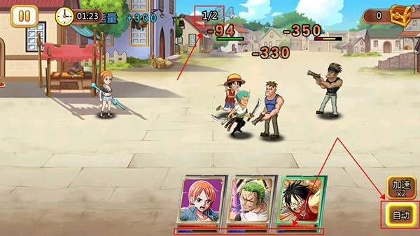5、进入战斗后,玩家可以打开自动及倍速开关,英雄会自动战斗,在下方能量条满后,英雄还会自动释放技能,将敌人全部击败即可获得关卡胜利。