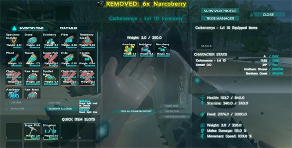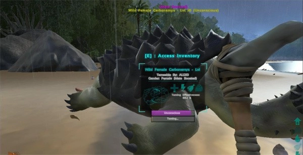 当把恐龙打晕后,恐龙头顶会出现一个带有紫色条的对话框。这时,按下“E”键打开我们的背包,接着把食物投放到面前恐龙的背包里,恐龙就会吃掉这些食物。不过要注意,恐龙的负重存在上限。