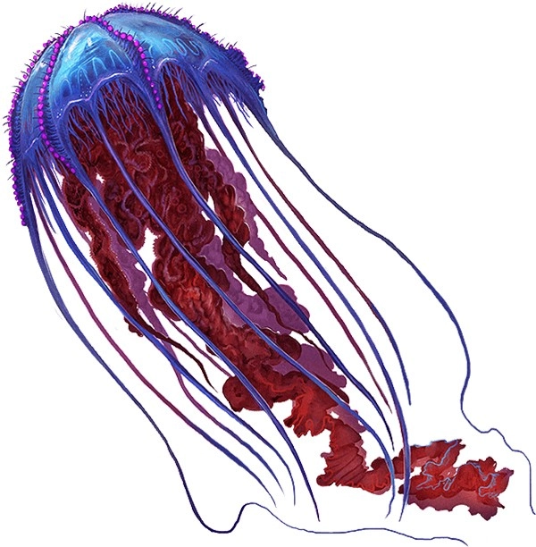 钵水母融合了多种水母的特性,它承继了大型蛋黄水母的体型与形态,具备箱形水母的强力针刺,还拥有深海水母的生物发光特点。这些特质相互结合,造就了一种能够照亮海洋最深处的危险生物。