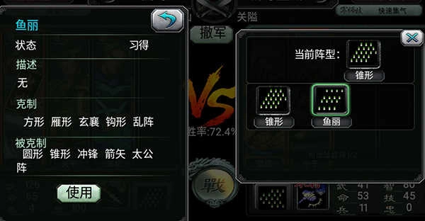 在同等兵力下,阵型决定兵种是否有更高的杀伤力,而当我方为远攻型武将,敌方为近战型武将时,就需兵阵有效阻挡敌将接近我方将领进行近战。