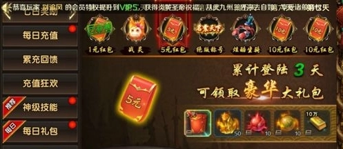 当你达到一定级别后,游戏界面右上角会开启奖励大厅功能。该功能内奖励丰富,可供领取。比如其中的7日奖励,每日都能领取不同奖励,有红包、坐骑、称号以及战灵等,这些奖励都不容错过。此外,还有每日礼包、装备首爆等,只要奖励大厅里有红点提示的地方,我们就可以去领取相关奖励,这些都是助力我们快速提升战力的直接资源。