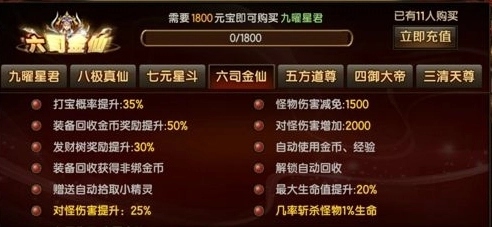 这款游戏设有7种不同类型的特权赞助,每种特权赞助都有对应的独特特权可供使用。其中,九耀星君特权级别最低,它不仅能提高打宝概率、增强对怪物的伤害,还能实现金币和经验的自动使用,装备回收奖励也会提升20%。而三清天尊特权级别最高,除涵盖前6种特权的所有奖励和福利外,还有更多福利可领取。不过,这些特权都需充值获取,玩家可依据自身情况选择资源。建议玩家至少选择九耀星君特权,如此在提升战力方面会更迅速一些。