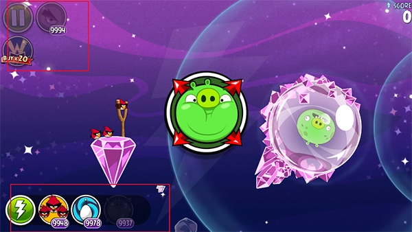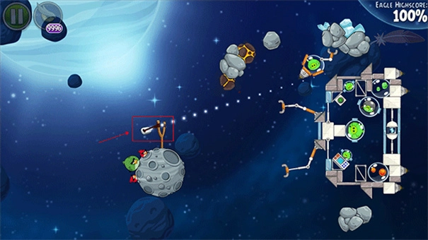 太空穿梭鸟(原黄色的三角形鸟)拥有非同凡响的天赋,当它被发射到中途的时候,轻轻点击一下屏幕,它就会进行直线式的冲刺攻击!犹如导弹一般,以恐怖的速度冲向绿猪,威力极大!不过,加速的时机很难掌握,否则很可能会飞出打击目标,无法制造精确打击。但一旦掌握好使用方法,愤怒的小鸟就会真正地愤怒起来,给木质结构的猪堡制造极大的破坏。