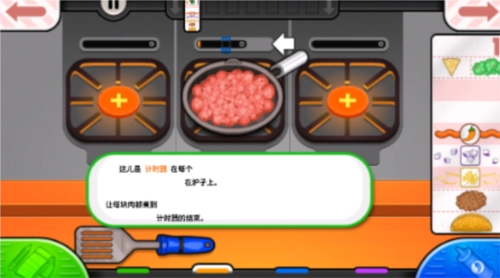 6、接下来,我们在灶台上加热肉,旁边有一个计时器。当计时器显示为绿色时,拖动铲子翻动食材。待时间结束,将食材拖动到饼里,随后点击蓝色按钮。