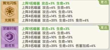 而特殊类型的光辉和暗夜只需要上阵一张,就能激活额外加成效果,总共五张卡牌,各位小伙伴们可自行搭配,最主要还是根据主力阵容来进行培养,触发不同的额外属性。