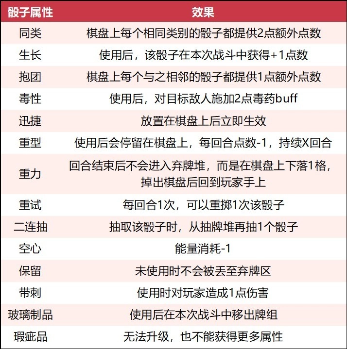 当下游戏设定了10余种骰子属性,诸如[同类]、[重型]、[玻璃制品]、[瑕疵品]等等。骰子属性并非全是正面作用,多数属性可助力玩家提升点数、节省能量,然而,像具备[带刺]属性的骰子会对玩家造成伤害,拥有[瑕疵品]属性的骰子则不允许玩家对其进行升级与改造。