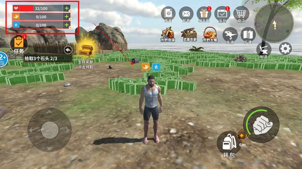 3、左上角是人物状态,红色是生命值、黄色是饥饿值、蓝色是水分,保持每日所需才可以进行其他活动哦!