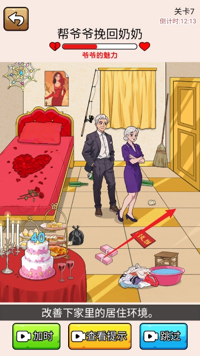 3、关卡内如果没有头绪可以点击屏幕下方按钮,看广告获得提示或跳过。