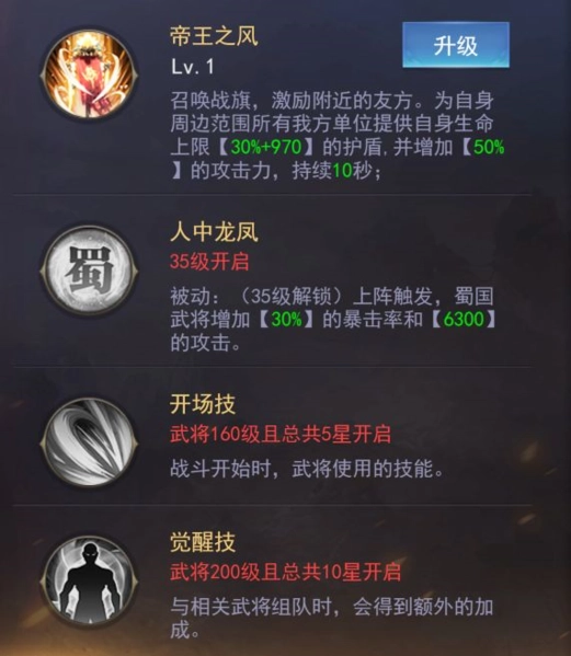 孙权在前期,其技能主要是为自身以及所带领的己方士兵提升攻击力与防御力,使自己兼具出色的抗击打能力与强大的攻击能力。待等级达到35级后,会解锁被动技能,此技能能够助力吴国将领提高闪避率与攻击力。(从技能效果来看,若不搭配一名吴国武将,确实有点说不过去呢。)