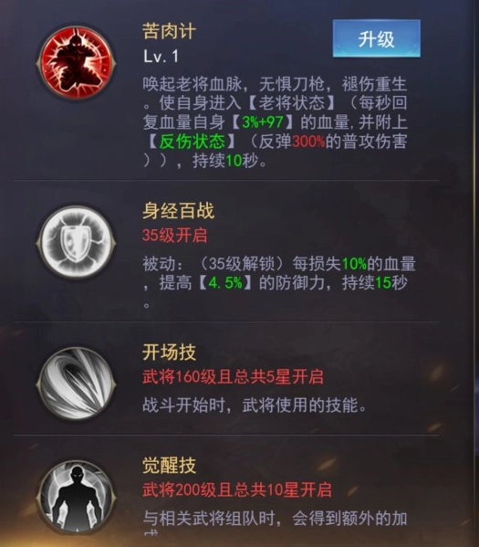 游戏一开始,角色就自带技能苦肉计,这技能简直就像是给黄盖披上了一层超强反甲,敌人打过来的伤害,会以三倍的数值反弹回去,敌人伤害越高,我就越兴奋,哈哈哈哈!(有种就尽管来打)等角色升到35级,就能解锁被动技能,每损失10%的血量,就能提升自身4.5%的防御,这耐打程度,谁能不佩服~