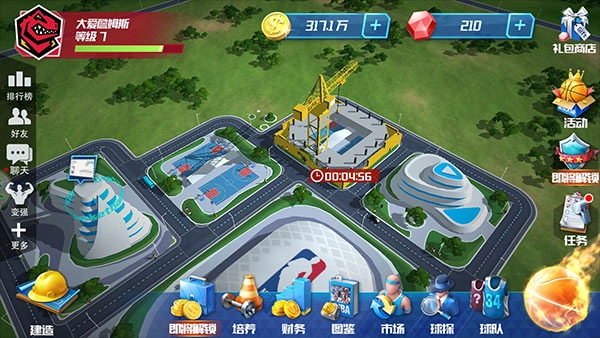 在主页面,我们会发现有很多建筑是需要建造和升级的。我建议先间两个健身房和两个训练场,重点培养乐福和姚明,白天训练时间段的球员,晚上就训练时间长的球员,这样可以合理利用时间。第一天训练场和健身房的等级要达到3级以上,第二天要能达到五级,至少四级。这里需要用宝石,所以不要太抠门。后面玩家要继续建造公寓、宿舍、名人堂,这对提升训练速度和球员体能恢复很有作用,另外也可以节省支付的工资。
