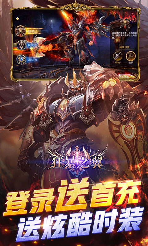2、登录即送超值首充,内含高阶羽翼:毁灭之翼、九阶武器,还有森罗枯骨时装30天(1套)、天刑尽灭时装30天(1套)