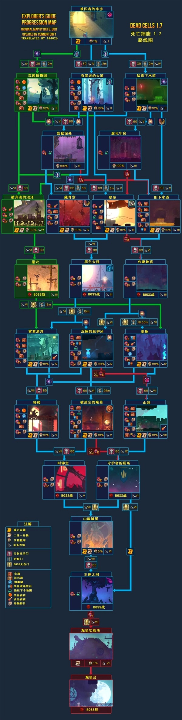 这是1.7版本线路图,可供参考。若有看不懂之处,留意注解。(绿色线路为坏种DLC更新内容,可先略过。)