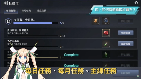 除了或许仅有一次的新手引导外,像每日上线签到、每日任务、每月任务、主线任务、完成主线各难度中英雄不死亡所获的任务奖励、决斗场、攀爬无限之塔等,都能提供红宝石。而且在这个过程中,也常常能得到英雄和宠物抽奖券。因此,请一定要尽可能完成每一个可以完成的任务,如此才能更快速地积累资源哦!