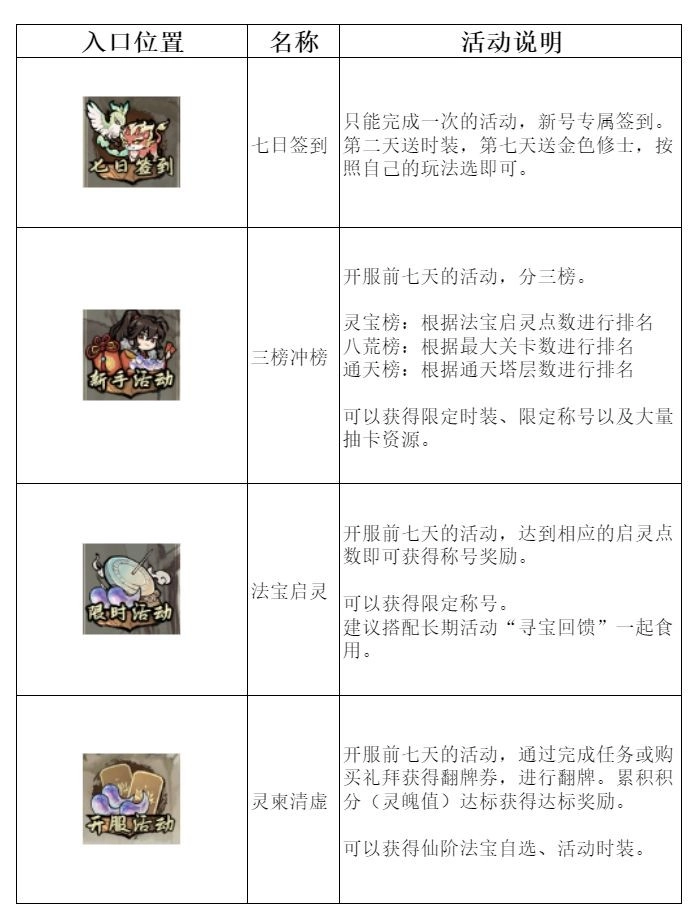 游戏设有四个新手活动,分别为七日签到(新号福利)、法宝启灵(限时活动)、新手活动(三榜)以及开服活动(灵柬清虚) 。
