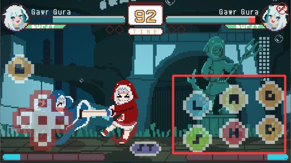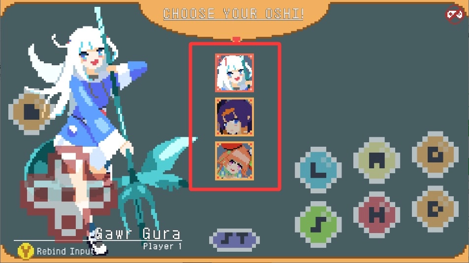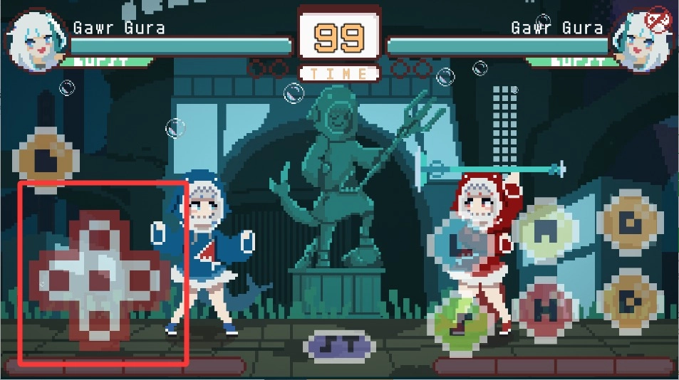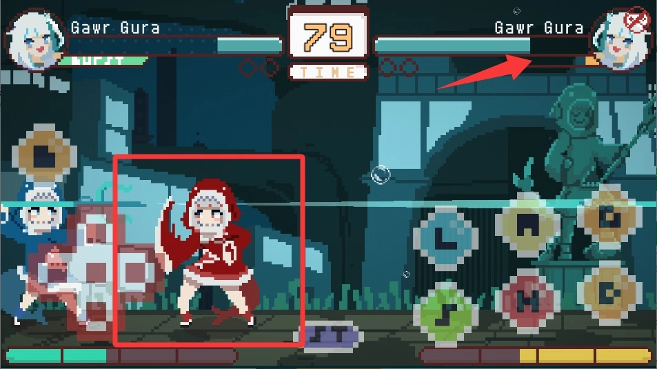 1. 经典的像素美术风格,将复古街机格斗的氛围完美还原。角色设计以holo myth成员形象为蓝本,每个角色都具备独特的战斗动画与特效呈现。