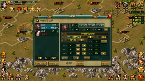 小号助力方法:创建几个小号,把等级提升到五六十级。每个小号培养两名将领,在进行种田、修炼操作的同时,让这两名将领去刷无损战斗。如此一来,就能轻松拥有三队60级以上的将领。