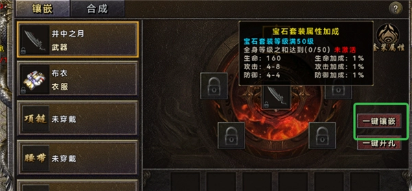 2、能够在武器、服装上镶嵌宝石,当宝石套装达到满级时,即可激活属性加成。