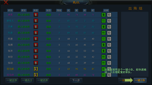 6、若点击出征,便会进入编组界面,点击右下角的一键小队,能够快速完成编组。