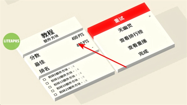 3、在结算界面查看游戏成就,包括粉碎方块的分数以及教程完成情况,以此了解游戏进度。