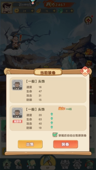 2、把获取到的装备与自身现有的装备作比较,保留属性高的装备,卖掉属性低的装备来换取铜币。